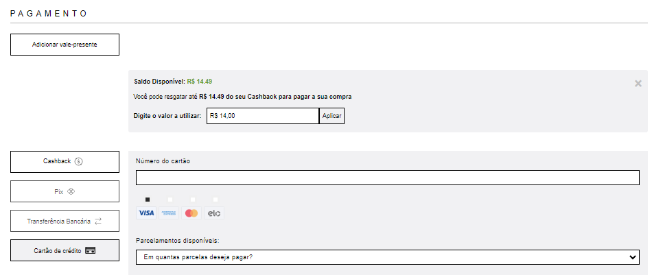 ao realizar a compra. Escolher a opção CASHBACK e selecionar o valor disponível para uso.